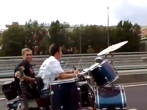これが本当の路上ライブ!? バイクのサイドカーを改造し、ドラムを積んで高速で走行しています。しかも演奏しながら。バイクの後部座席にはギタリスト。ベースの加入 .. ..続きを読む